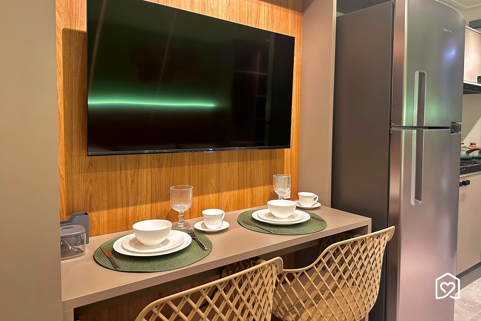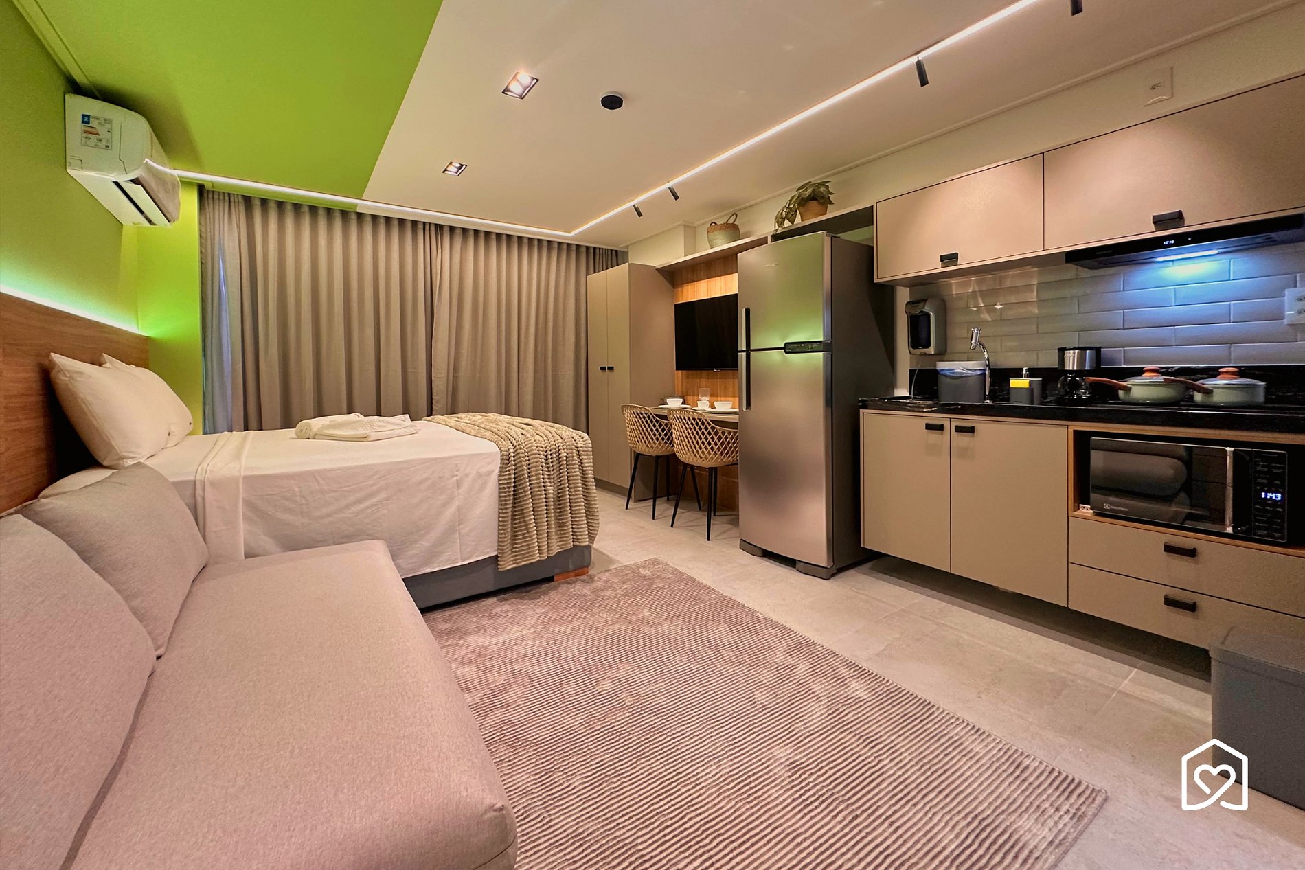 - Cozinha bem equipada - Mesa e Cadeiras - Smart TV - Sofá-cama casal - Varanda vista cidade - Quarto climatizados - Cama Queen - Guarda roupas - Banheiro projetado - Chuveiros elétricos
